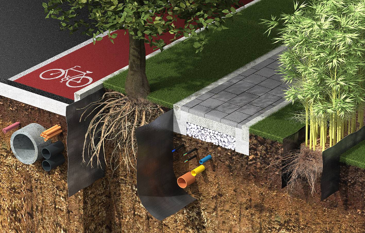 Root-resistant screens during the construction of a sidewalk and a cycle path